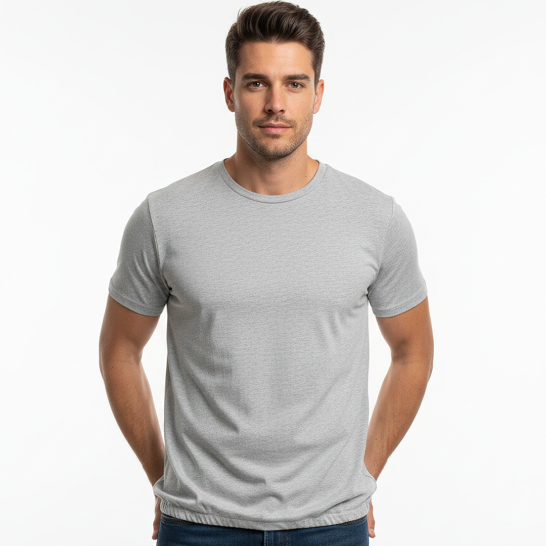 Su tono gris (estilo melange) es el comodín perfecto: no es tan informal como una remera blanca ni tan serio como una negra. Es el equilibrio justo para lograr un look prolijo y relajado al mismo tiempo. El corte es clásico y recto, pensado para ofrecer libertad de movimiento sin quedar demasiado holgado.