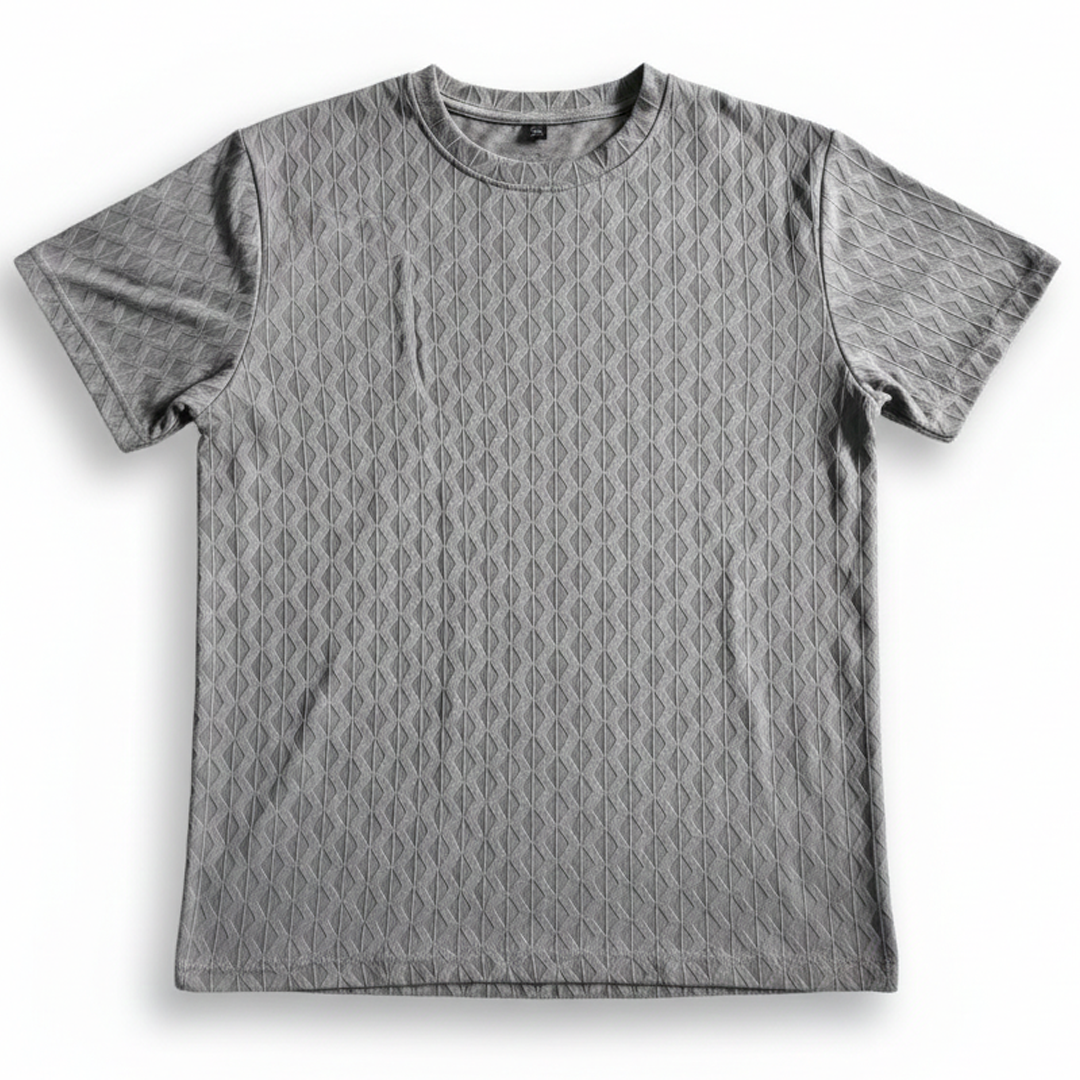 Si estás buscando salir de las remeras lisas tradicionales sin caer en estampados llamativos, esta Remera Gris con Textura es la opción ideal. Su principal atractivo es el tejido con diseño de rombos en relieve que cubre toda la superficie. Este efecto 3D no solo es agradable al tacto, sino que genera un juego de luces y sombras que le da una apariencia mucho más sofisticada y premium que una remera de algodón común.