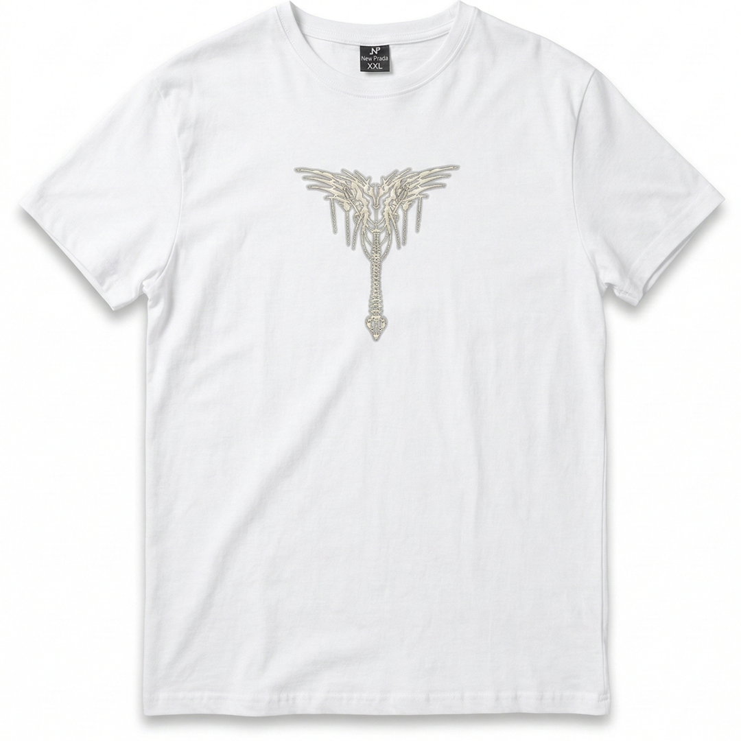 Elevá tu rotación de remeras con esta exclusiva Remera New Prada en Talle 5 (XXL). Sobre una base blanca clásica e impecable, esta prenda se roba todas las miradas gracias a su imponente estampa frontal: un intrincado diseño simétrico en tonos grises y arena que fusiona una estética cyberpunk con motivos góticos, simulando estructuras óseas o alas metalizadas.