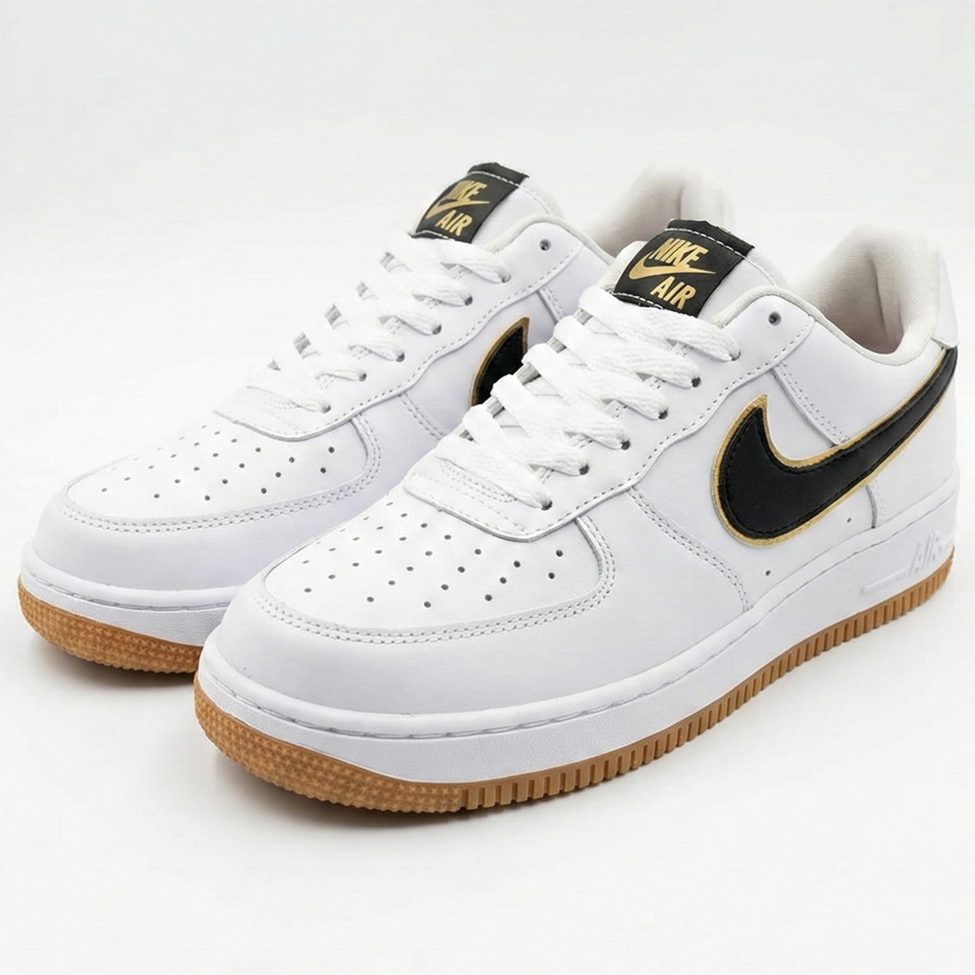 Estas Zapatillas Nike Air Force 1 en talle 38 son la definición de sofisticación en calzado urbano. Este modelo eleva la silueta clásica blanca incorporando una suela de goma color caramelo (gum sole), un detalle que es tendencia absoluta por su estética vintage y su gran ventaja práctica: se mantiene impecable por más tiempo. El diseño se completa con el icónico Swoosh en negro delineado en dorado, a juego con la etiqueta de la lengüeta, otorgándole un acabado premium y exclusivo.